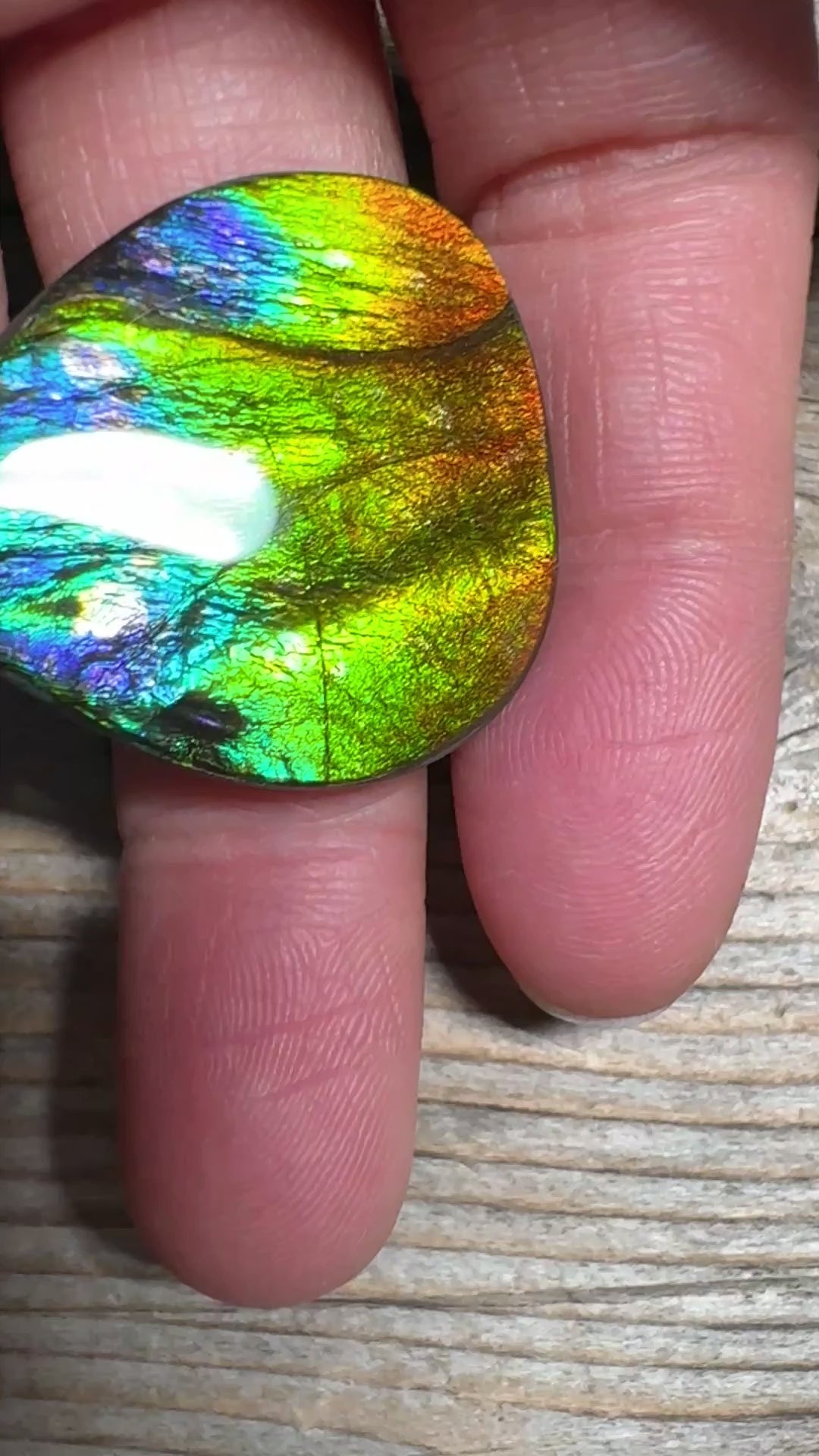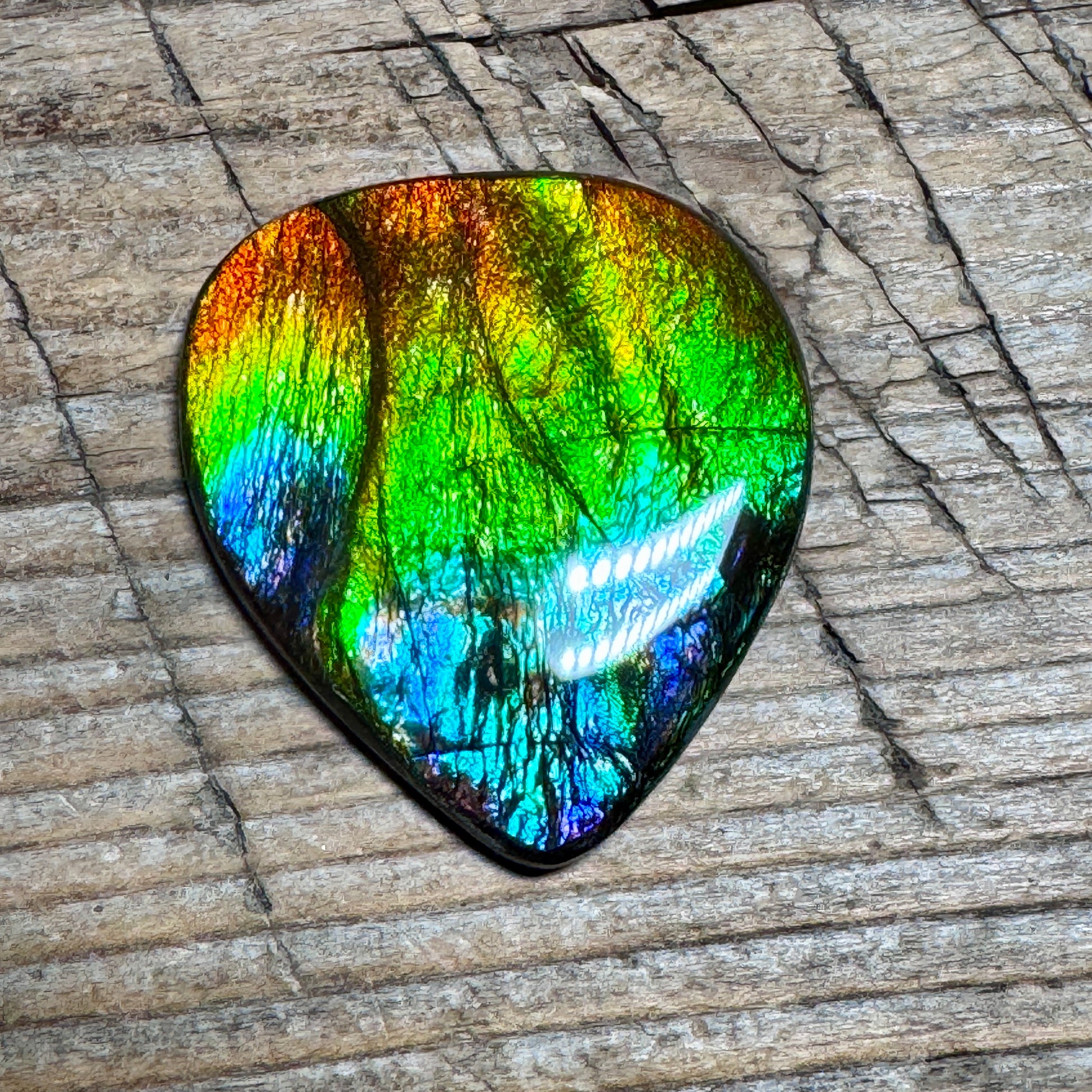 Bright rainbow-colored ammolite cabochon with a striking natural pattern!