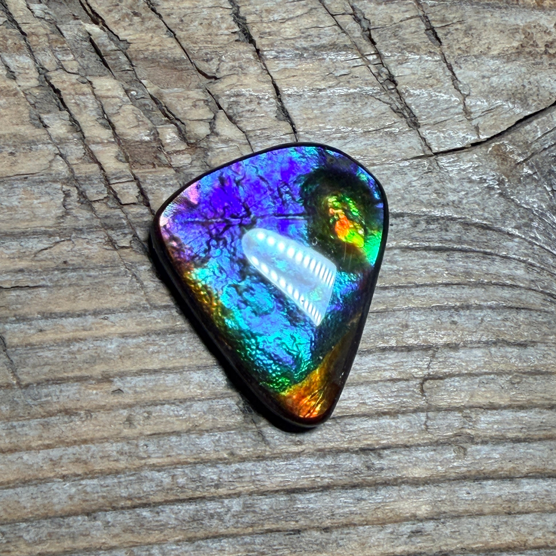 A colorful ammolite cabochon with bright blues, greens, golds, orange, and a rare touch of pink. Beautiful color play and a natural, eye-catching pattern.