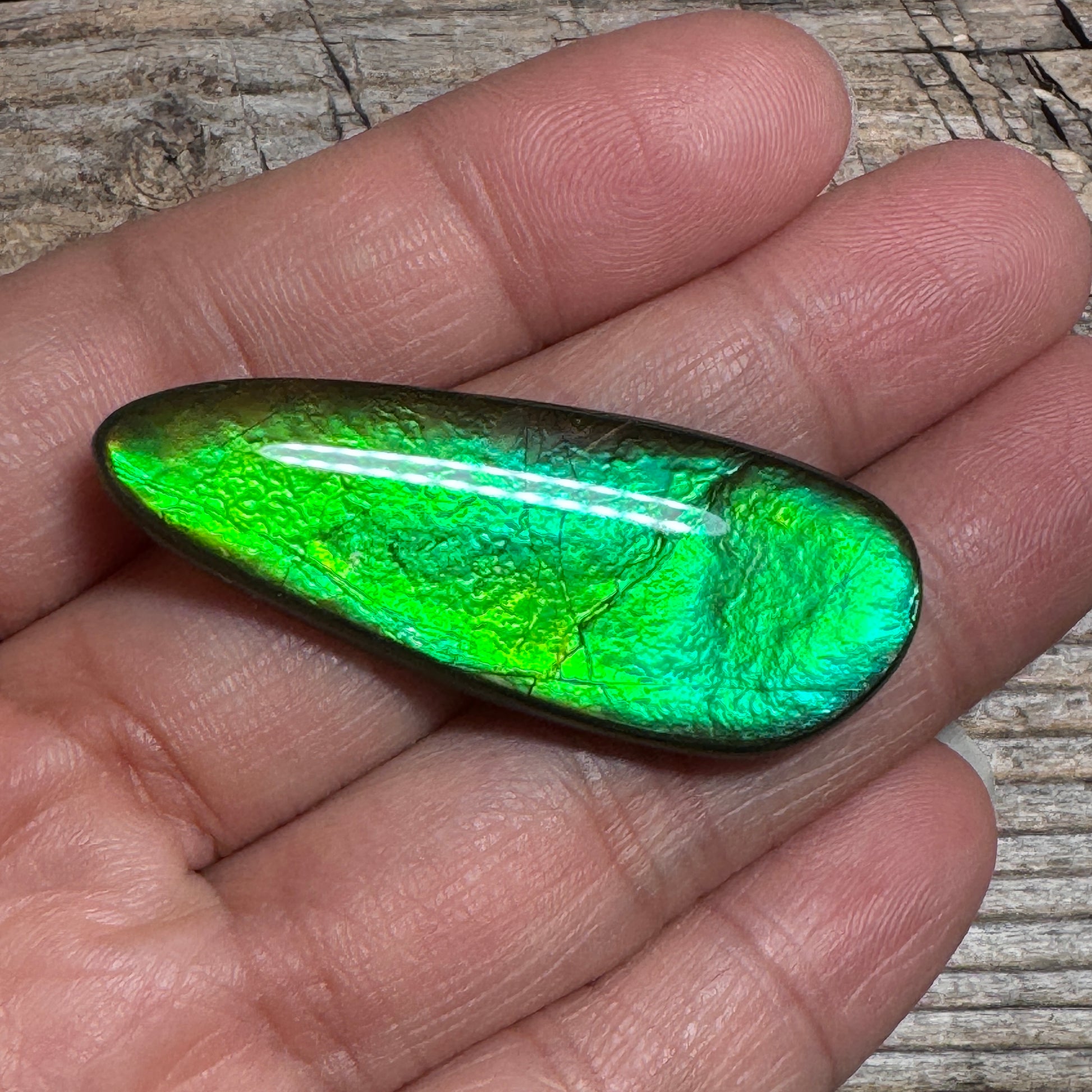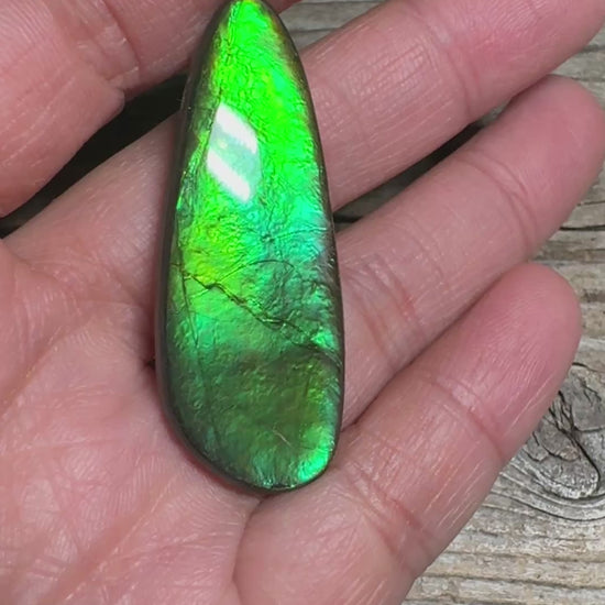 Ammolite cabochon features a crisp, bright green hue for a simple and elegant look.