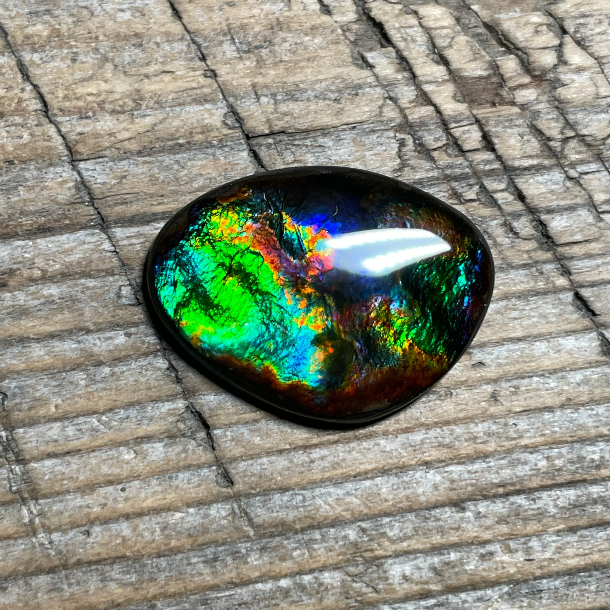 Not super bright, but this ammolite cabochon features a beautiful and rare colour pattern!