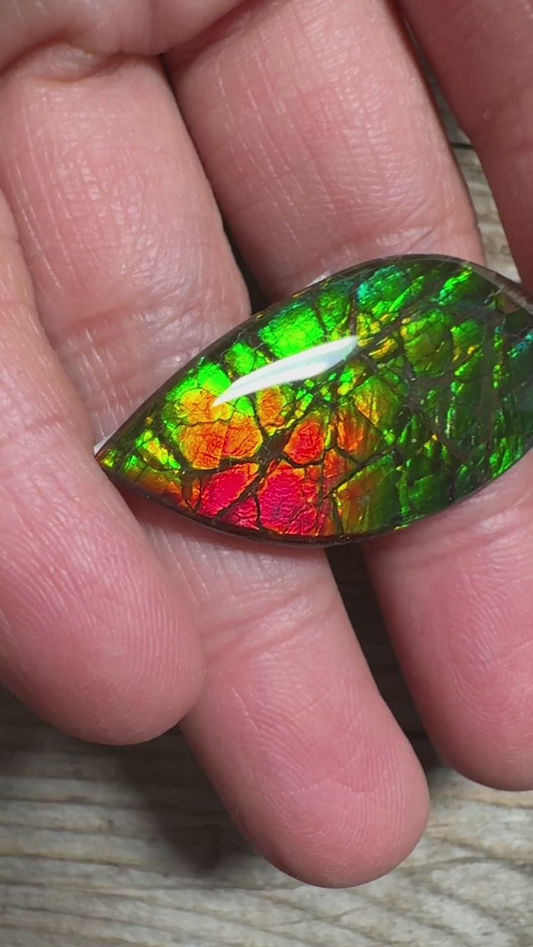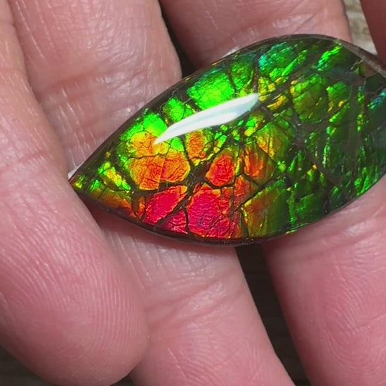 A stunning green and red ammolite cabochon with a captivating, dragon-skin pattern.