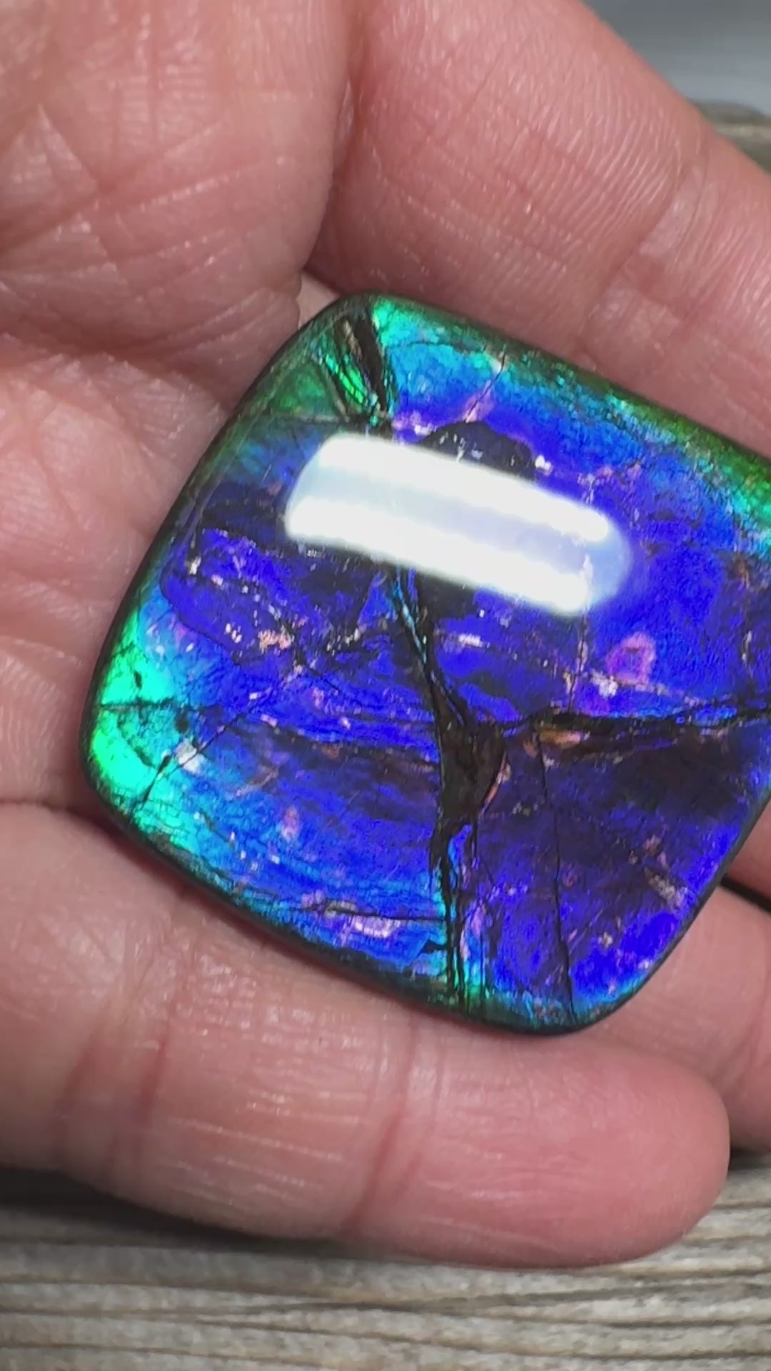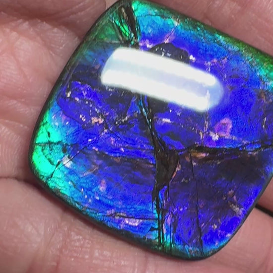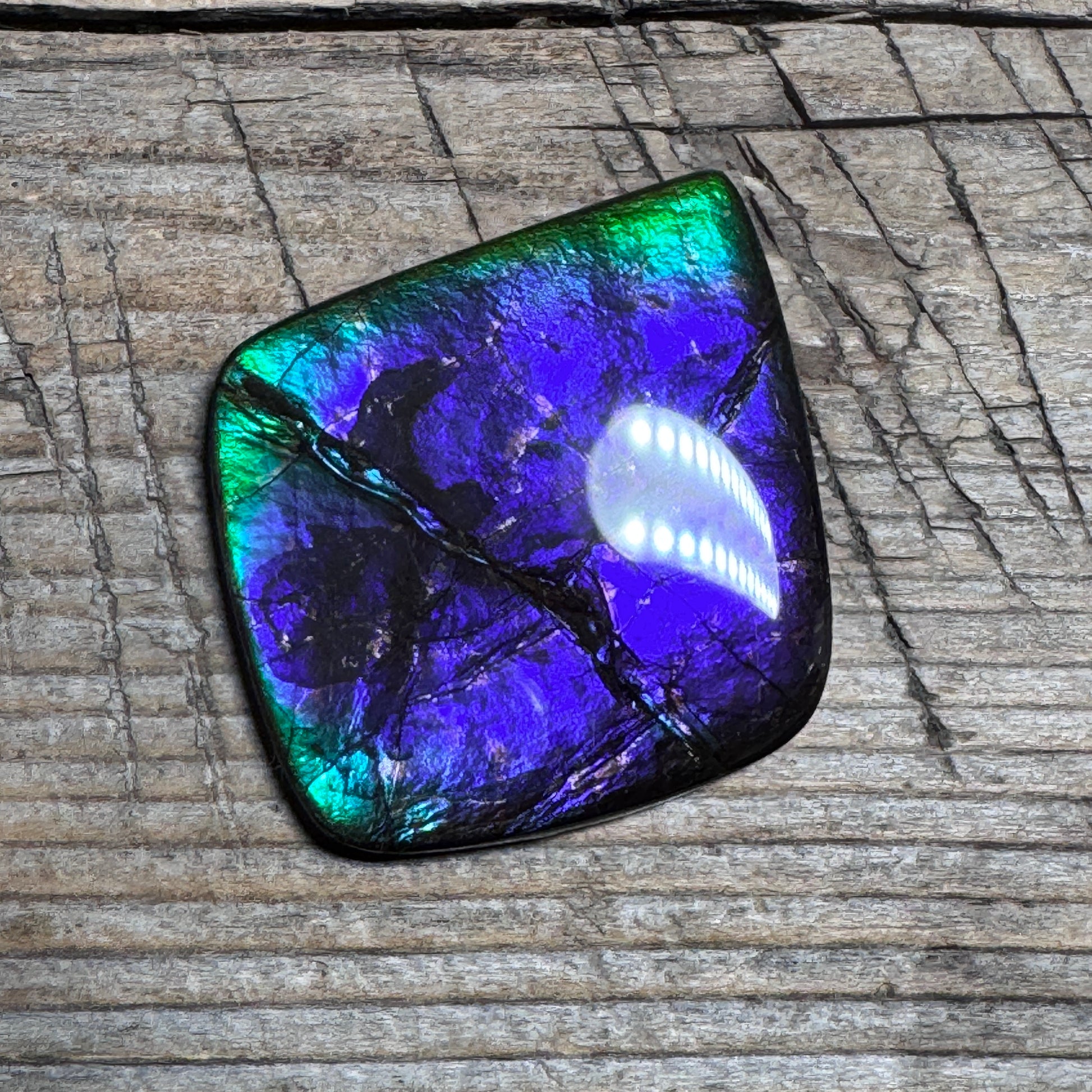 Gorgeous blue-green-purple ammolite cabochon with naturally vibrant color.
